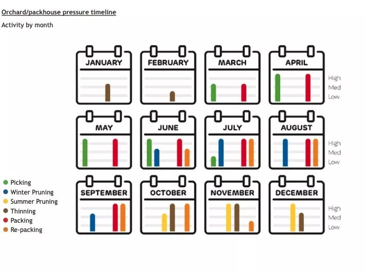 这类果园里的季节工主要包含采摘(picking)、冬季修剪(winter pruning)、夏季修剪(summer pruning)、间苗(thinning)、包装(packing)、再包装(re-packing)等。