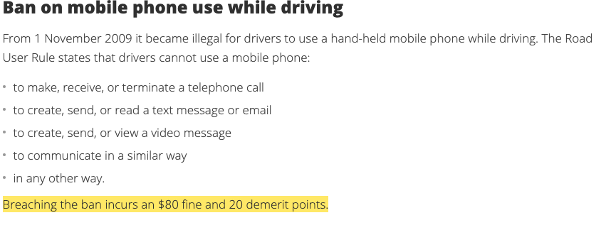 而所有导致开车分心的因素中,使用手机是最普遍的。其实,新西兰交通法规对驾车时使用手机有很严格的规定,不允许司机在车内手握手机进行任何操作,否则可能面临至少80纽币的罚款和20分的扣分。而这两年,新西兰也一直在讨论要加强开车使用手机的惩罚力度。