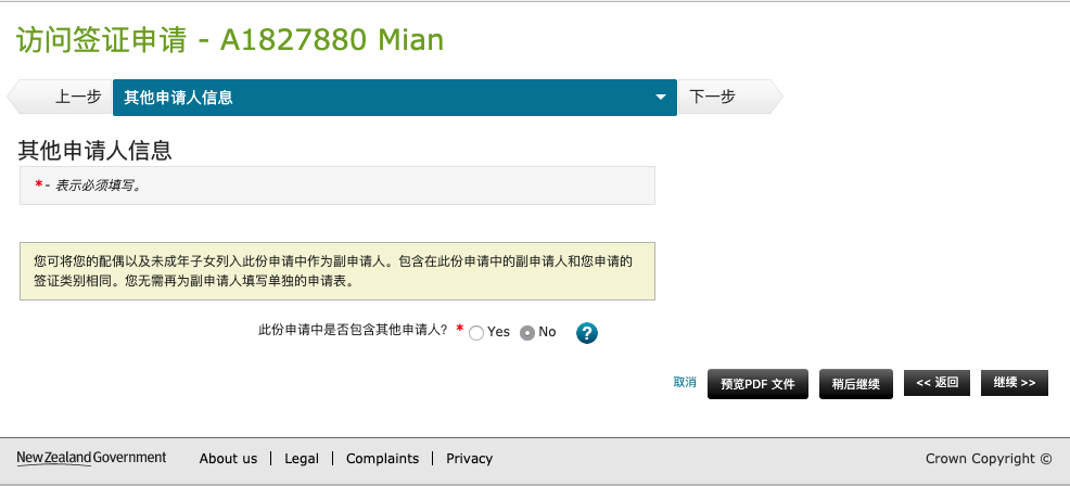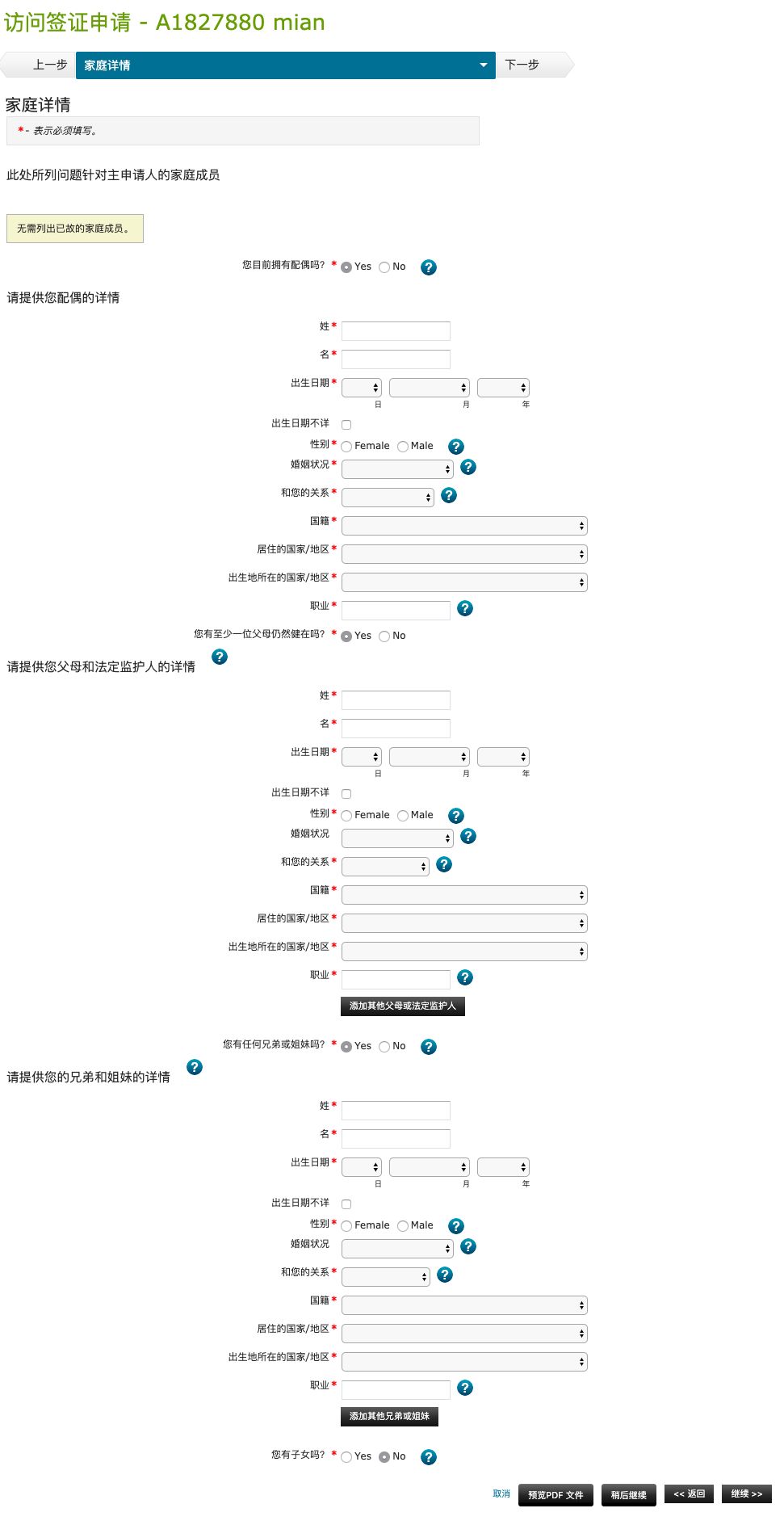 要注意的是,所有内容需要用英文填写,*号都是必填项。在组团申请部分,如果是独自申请,则选择no;如果与配偶或子女一起申请,可以选择yes。