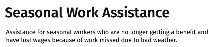 如果在最近的26周中在种植园工作,没有领取福利,且因为天气原因无法工作,没有工资,则可以领取季节工补贴,每周从52纽币到460纽币不等。