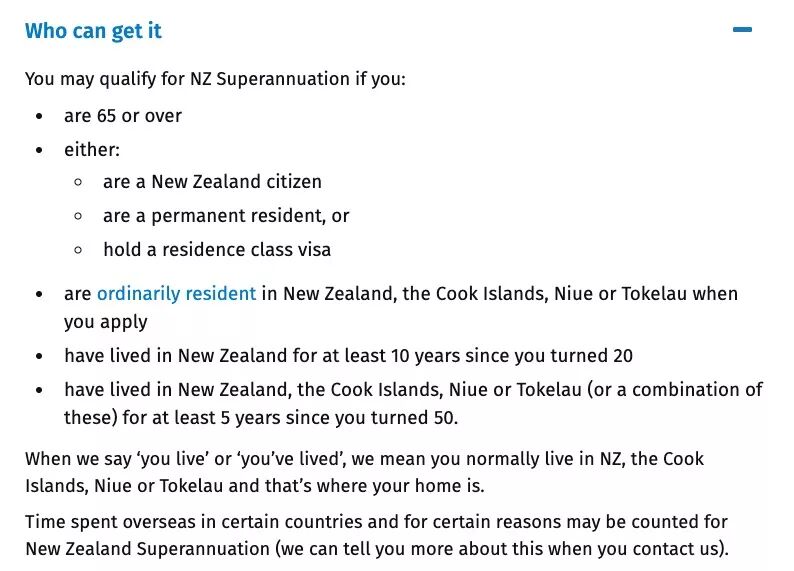 其他的福利,并不一定每个人都能领取,但新西兰的养老金Superannuation,却适用于绝大多数人,其领取条件比较简单,与对社会作出的贡献也不挂钩。