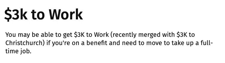 这里还要介绍一个$3k to Work福利,就是说如果你正在吃福利,但是为了接下一个全职工作,需要搬家的话,可以领取3000纽币的“启动金”。