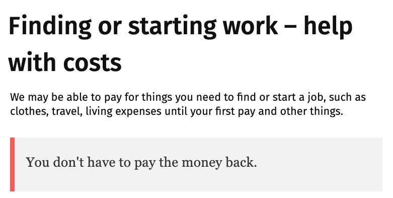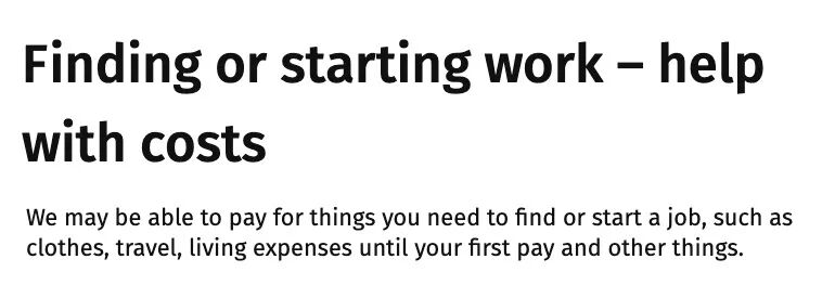 如果开始找工作,或者即将开始新工作,还有一笔一次性不用偿还的补贴,可用于面试置装、面试交通费、请翻译、购置工作所需的工具或服装、第一笔薪水之前的生活开支、洗纹身、面试或开始工作时照顾子女的费用