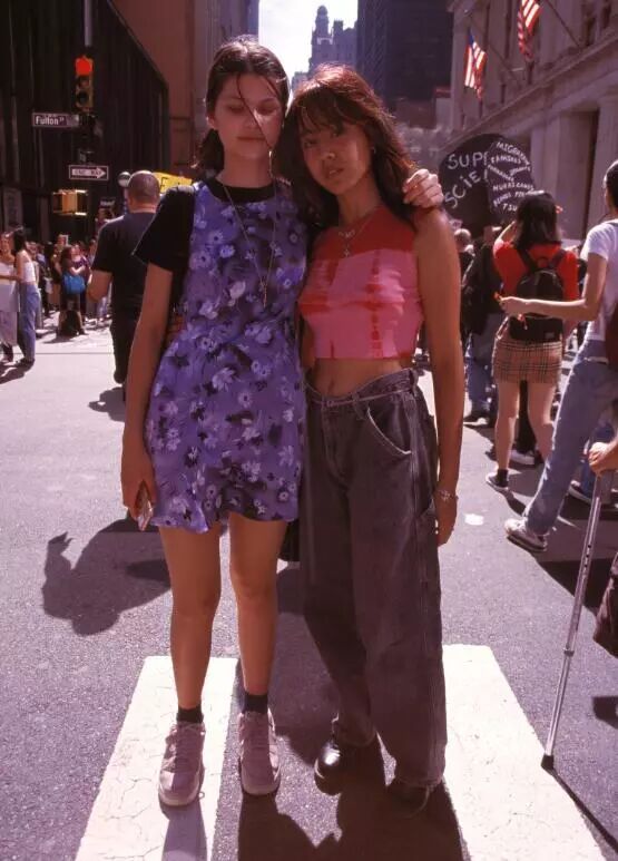 外国孩子们正大大方方穿着八九十年代的衣服上街去,热情摆着各种pose。
