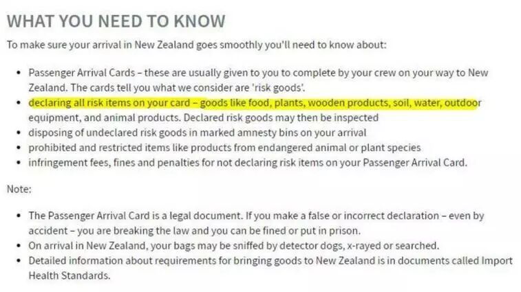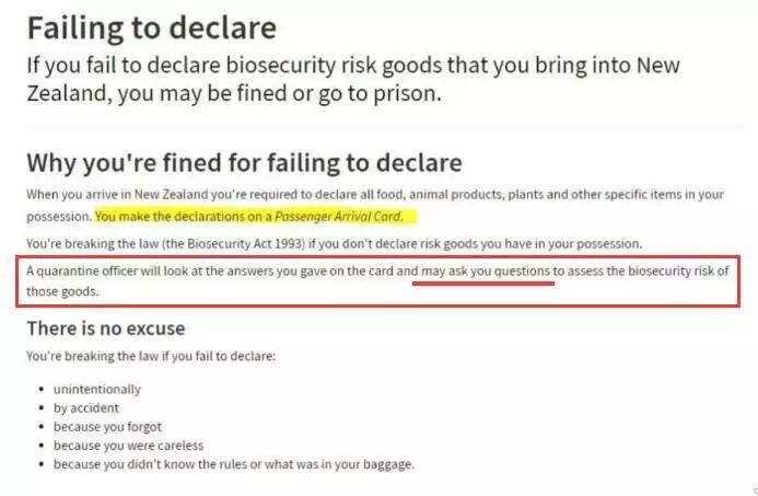 我们在新西兰海关官网对于“未能申报”的解释页面看到,虽然官方的确表示,申报必须要在入境卡上填写,但同时也提到,官员可能会对你进行提问,以此来评估你的行李是否存在生物安全威胁。