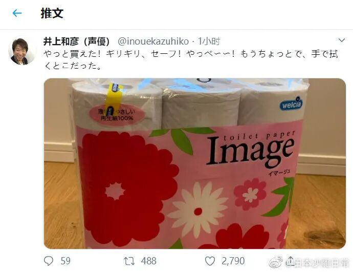 就连日本的声优井上和彦也忍不住要加入抢购厕纸大军,还发推说:“终于买到纸了,太险了,差点就要用手擦屁股了。”