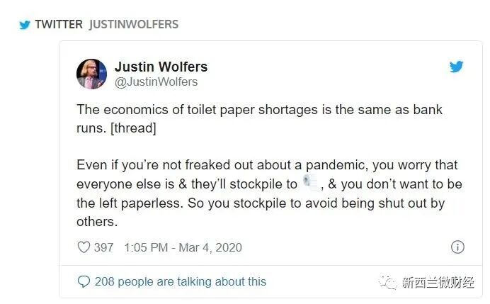 他说,从经济学上看,抢厕纸和银行挤兑形成的机制差不多。都是典型的恐慌效应。