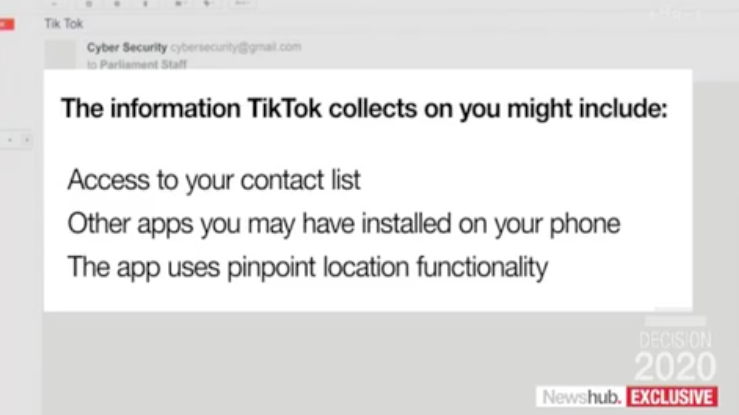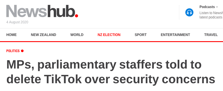 Newshub透露,“出于严重的安全隐患,议员和议会工作人员被要求删除热门视频应用TikTok”。
