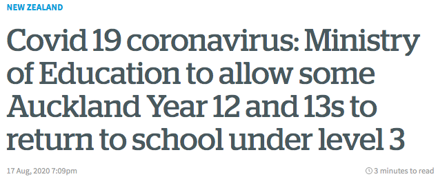 昨天(8月17日)下午晚些时候,政府表示,将允许校长决定是否让12年级和13年级的学生在3级警戒期间提前返校进行面对面的学习。