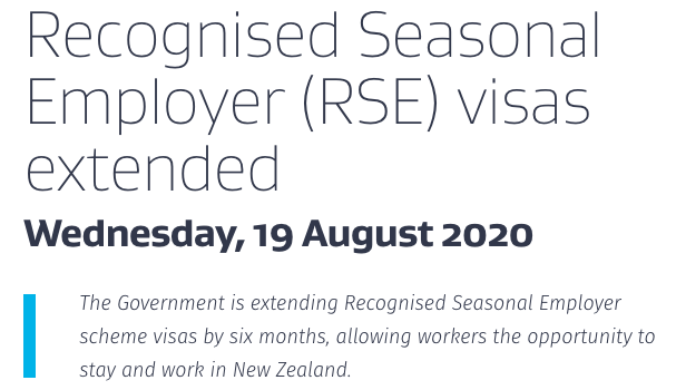 政府将给予认可的季节性雇主签证(Recognised Seasonal Employer,简称RSE) 6个月的延期,允许工人们有机会继续留在新西兰工作。