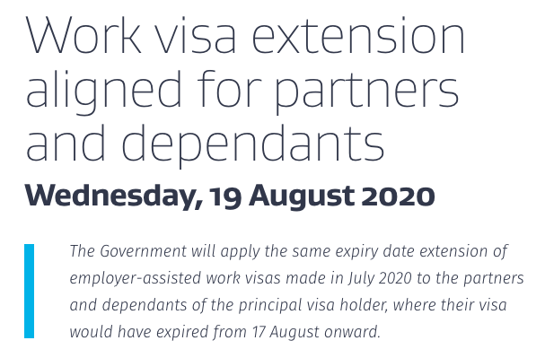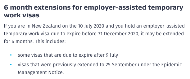 7月7日,移民局曾宣布,人在新西兰境内且持有今年12月31日之前到期的雇主协助工签(Employer-assisted work visa)的人,其签证有效期可以延长6个月。
