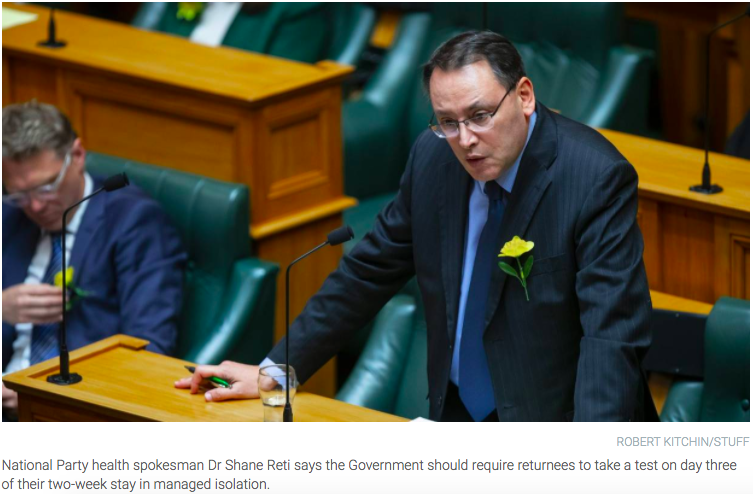 国家党卫生发言人Dr Shane Reti 希望政府强制对隔离设施中的返回人员进行检测,理由是:Covid-19可以通过拒绝检测的人进入社区。