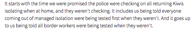 首先,我们得到承诺说,警察会检查所有归国新西兰人居家隔离的情况,但他们没有。然后我们被告知,每个离开隔离设施的人都要先接受检测,但他们没有。我们还被告知所有边境工作人员都接受了检测,但他们也没有。