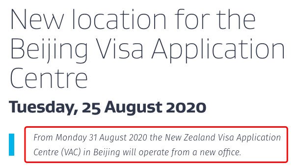 自2020年8月31日(星期一)开始,北京的新西兰签证申请中心(VAC)将在新的办公室运营。