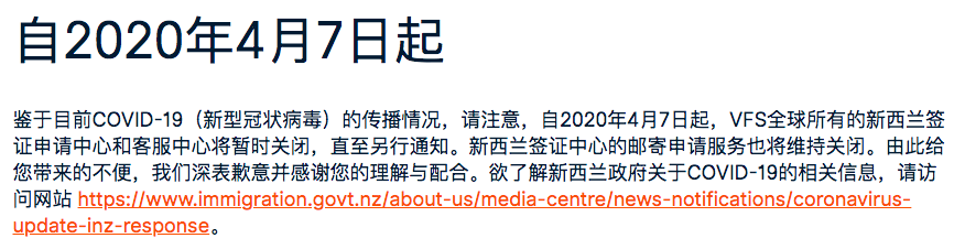 受新冠疫情影响,今年3月24日起,新西兰移民局临时关闭了中国大陆地区新西兰签证申请中心和客服中心,4月27日起临时关闭了全球所有的新西兰签证申请中心和客服中心,直至另行通知。