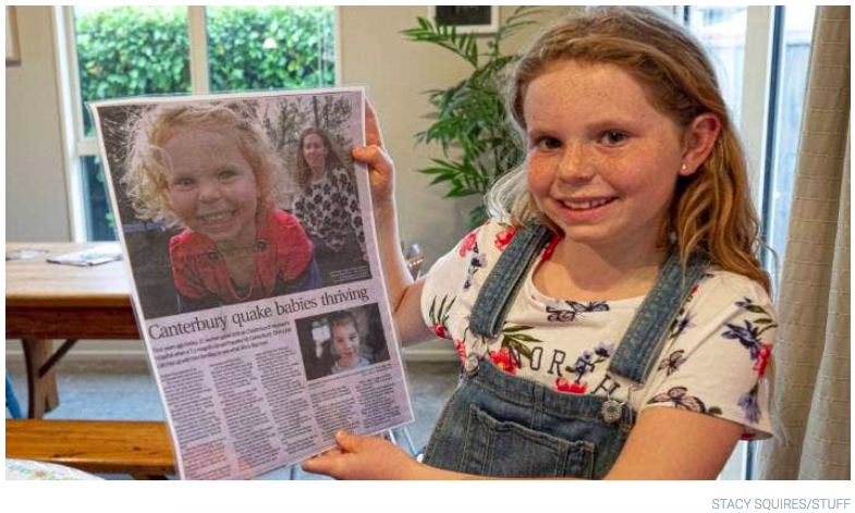 下图是另一个“地震宝宝”Lola,她手里拿着一份2014年的剪报,报纸上讲述了她的故事。