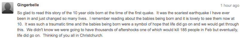 两位“地震宝宝”的故事被stuff刊载后,有一位读者留下了这样的一段话: