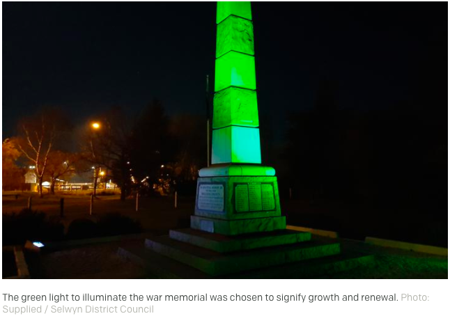 昨晚,Darfield War Memorial 点亮绿灯,以纪念这场地震10周年。