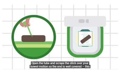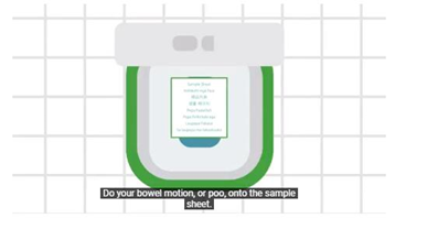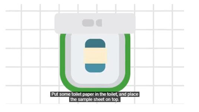 打开检测盒把里面的采样杆拿出来,快快地在采样纸上的大便上蘸取部分大便样本。(在大便沉下去之前快快取样。)
