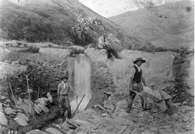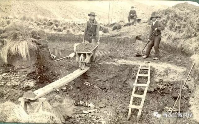 1860年代开始,中国南方人开始陆陆续续到新西兰淘金,这张有记录最早的照片之一,显示奥塔哥某地一个长老会的白人正监督两个中国矿工的淘金作业。