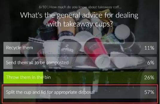 新西兰网站Stuff曾做过一个网调,发现有74%都把咖啡纸杯扔错了——有11%的人依然选择了扔进回收桶,有6%觉得可以送去堆肥,另外57%的人以为把盖和杯子分开扔是正解。