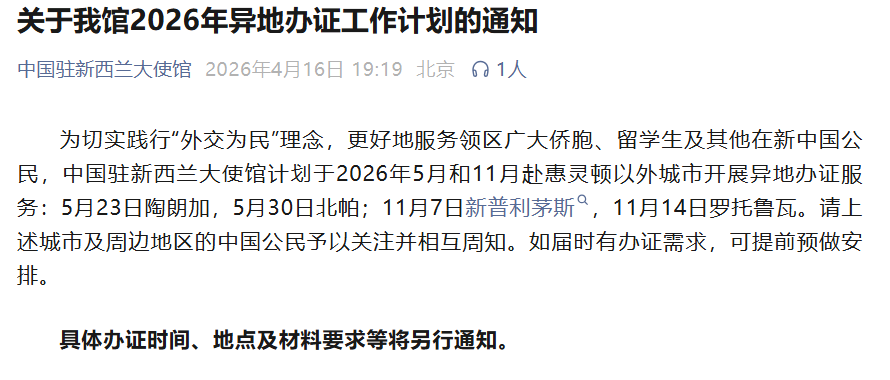 中国驻新大使馆发布2026年异地办证计划
