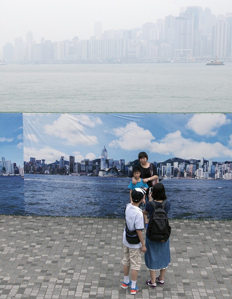 香港雾霾严重 内地游客无奈与"假蓝天"合影(组图)