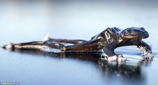 小青蛙跨越冰湖寻偶 被冻在湖面不能动弹(组图)