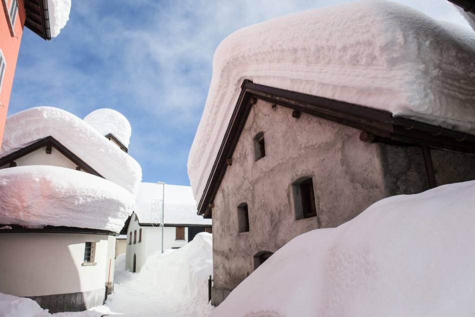 当地时间2013年2月9日,瑞士贝德雷托,房顶上堆满了厚厚的积雪,宛如童话世界。
