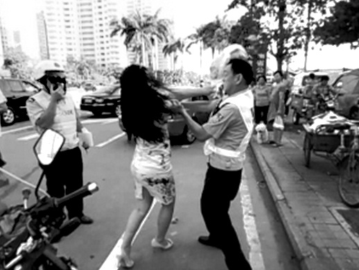 5月15日,据《南国都市报》报道,14日上午8时许,海口市紫荆路大转盘处,一牛姓女子在路边停车买菜被交警贴罚单。由于对交警执法尺度有质疑,双方争执过程中,该女子情绪激动将一名年近五旬的交警打伤。被打交警