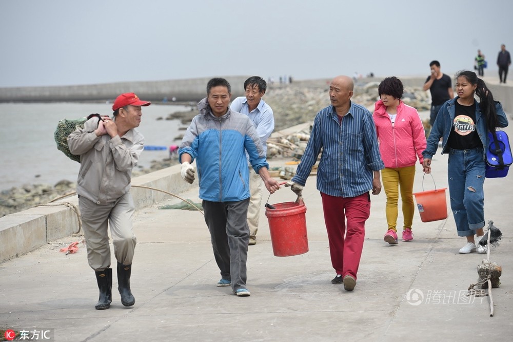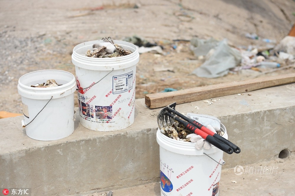 2017年5月29日,天津港出现疯狂的挖生蚝“吃货大军”,人比生蚝多。