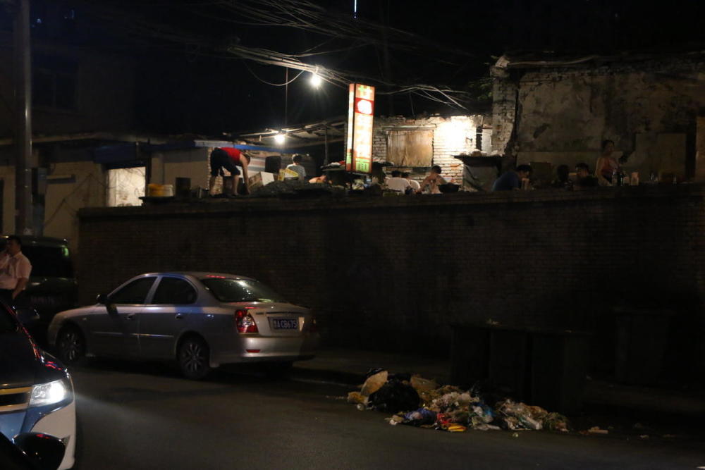 小摊旁是一排堆放垃圾的垃圾桶,相隔两三米则是用几个支架和塑料布搭起的简易棚子,几张桌子,几把椅子,一口大锅便形成一个夜宵店。“他们会时不时的挪地方,不过都在这一片儿,就算一段时间不来再来也能找得到。”一名食客说道。
