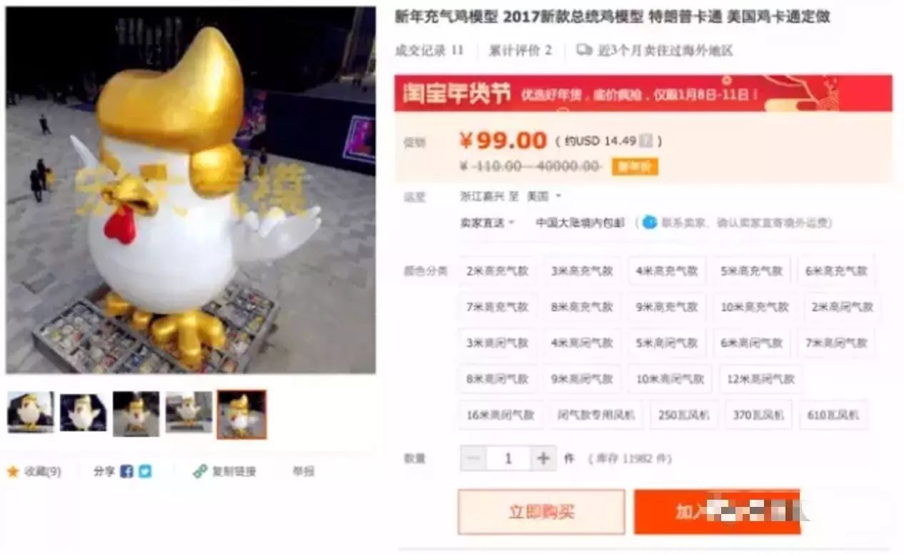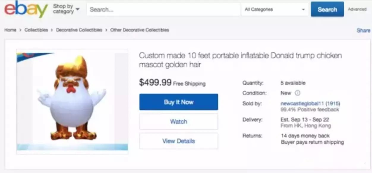 ebay上,有来自香港的卖家,以500美金(软妹币3300)的价格,出售3米高的充气川普鸡。