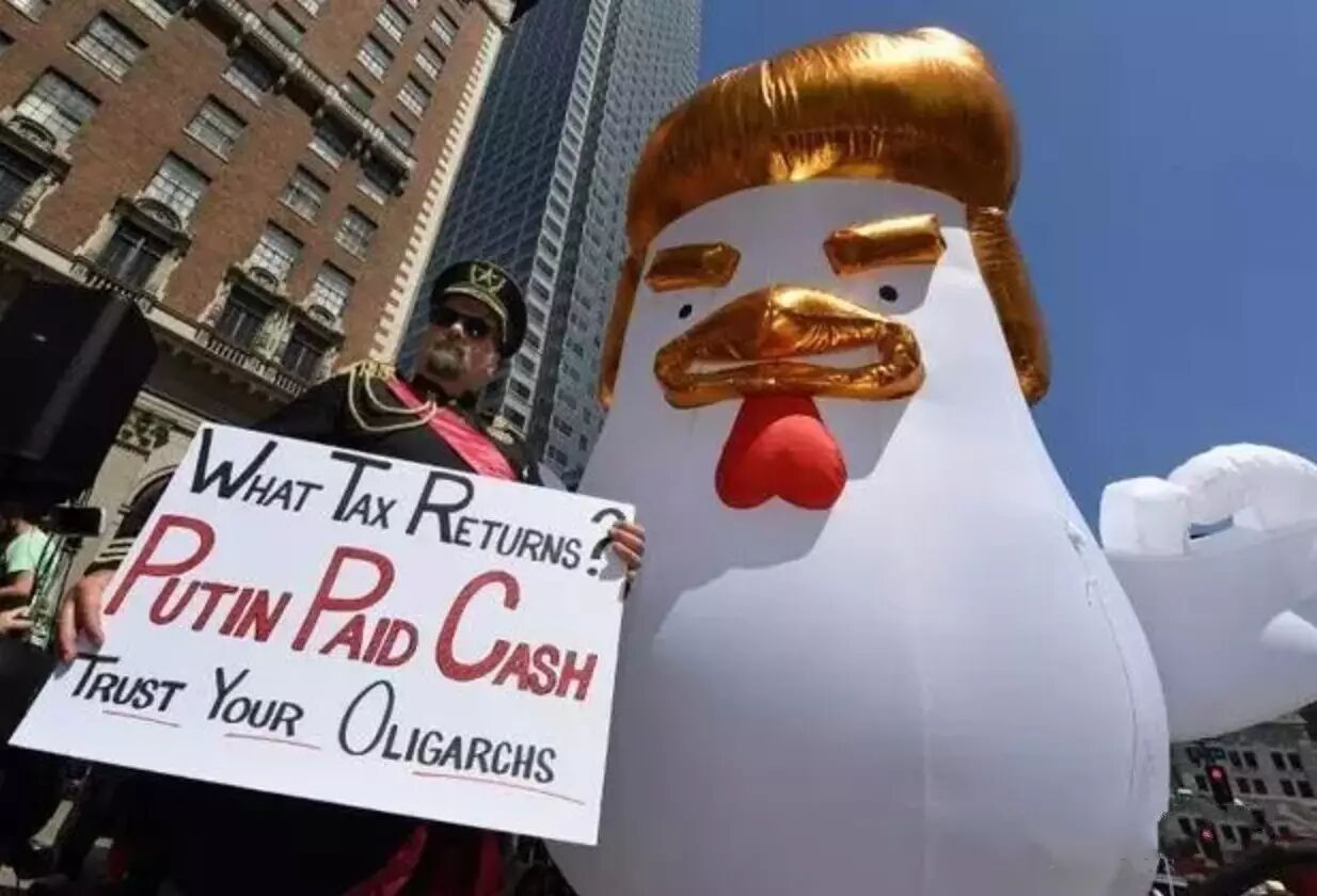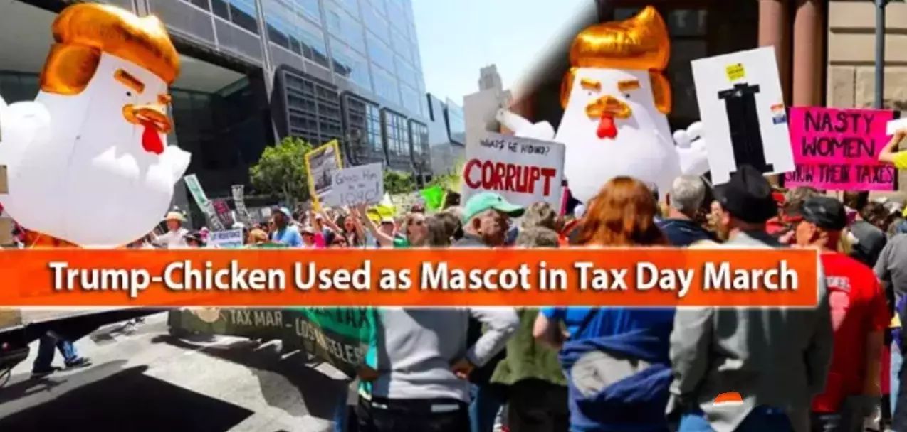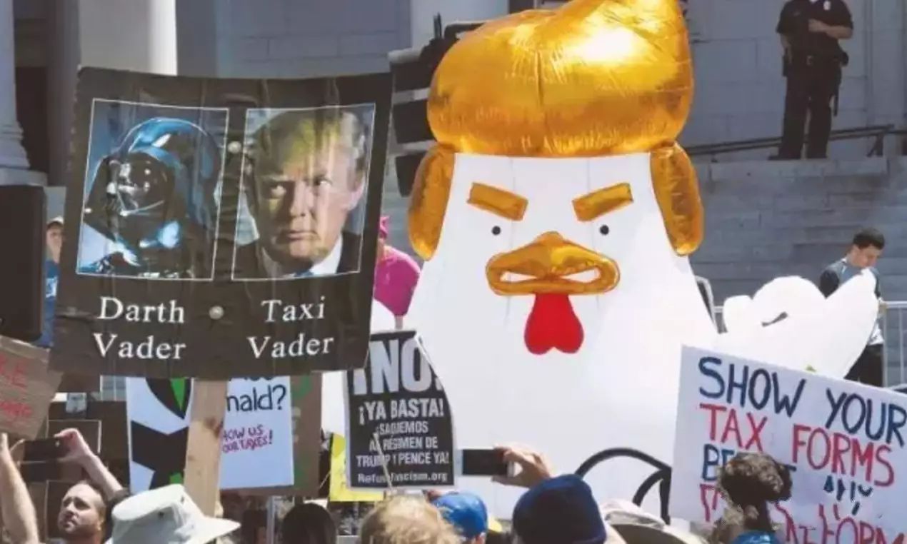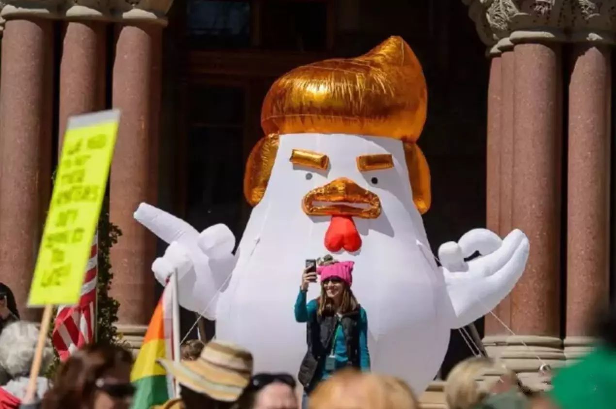 酷似川普的大公鸡出现在针对川普的游行活动中,可谓是相得益彰,