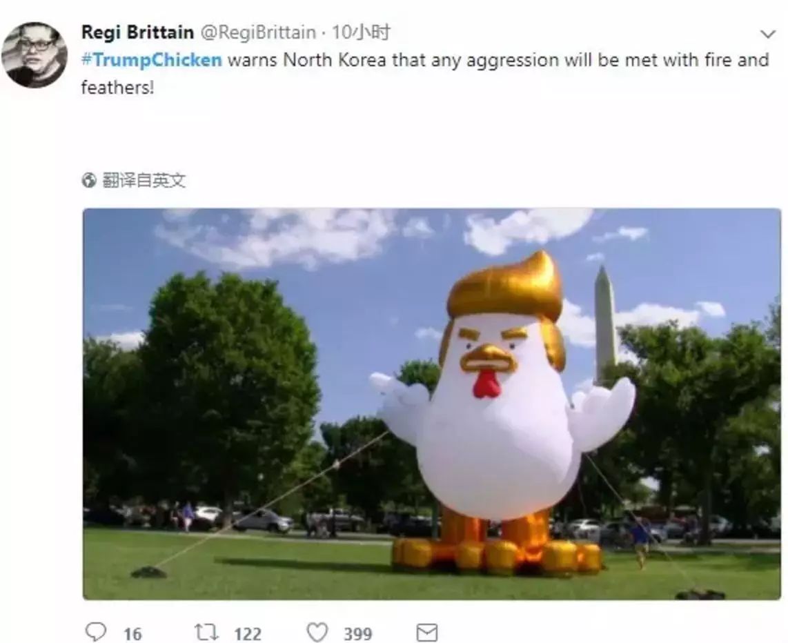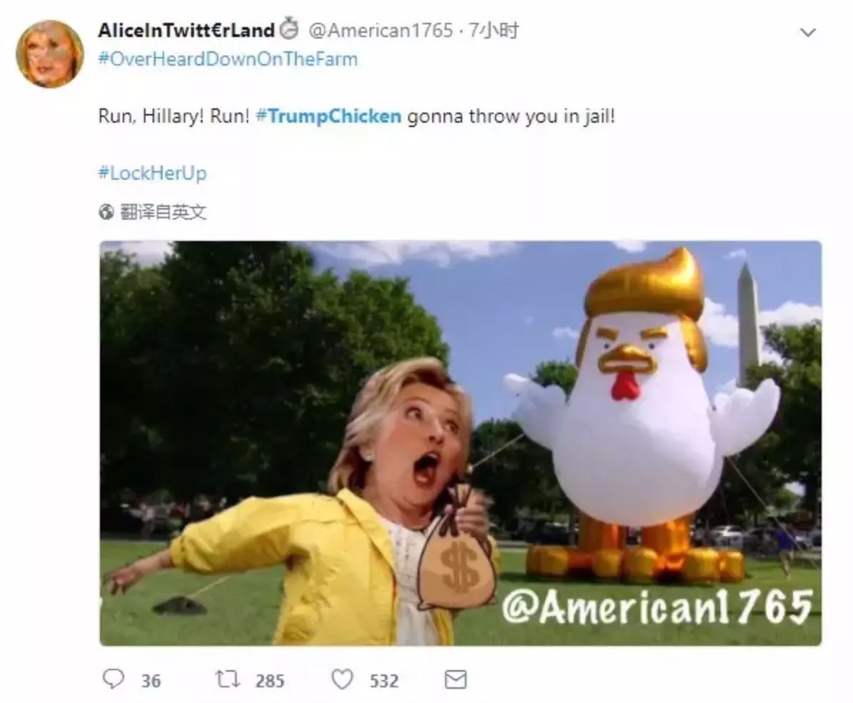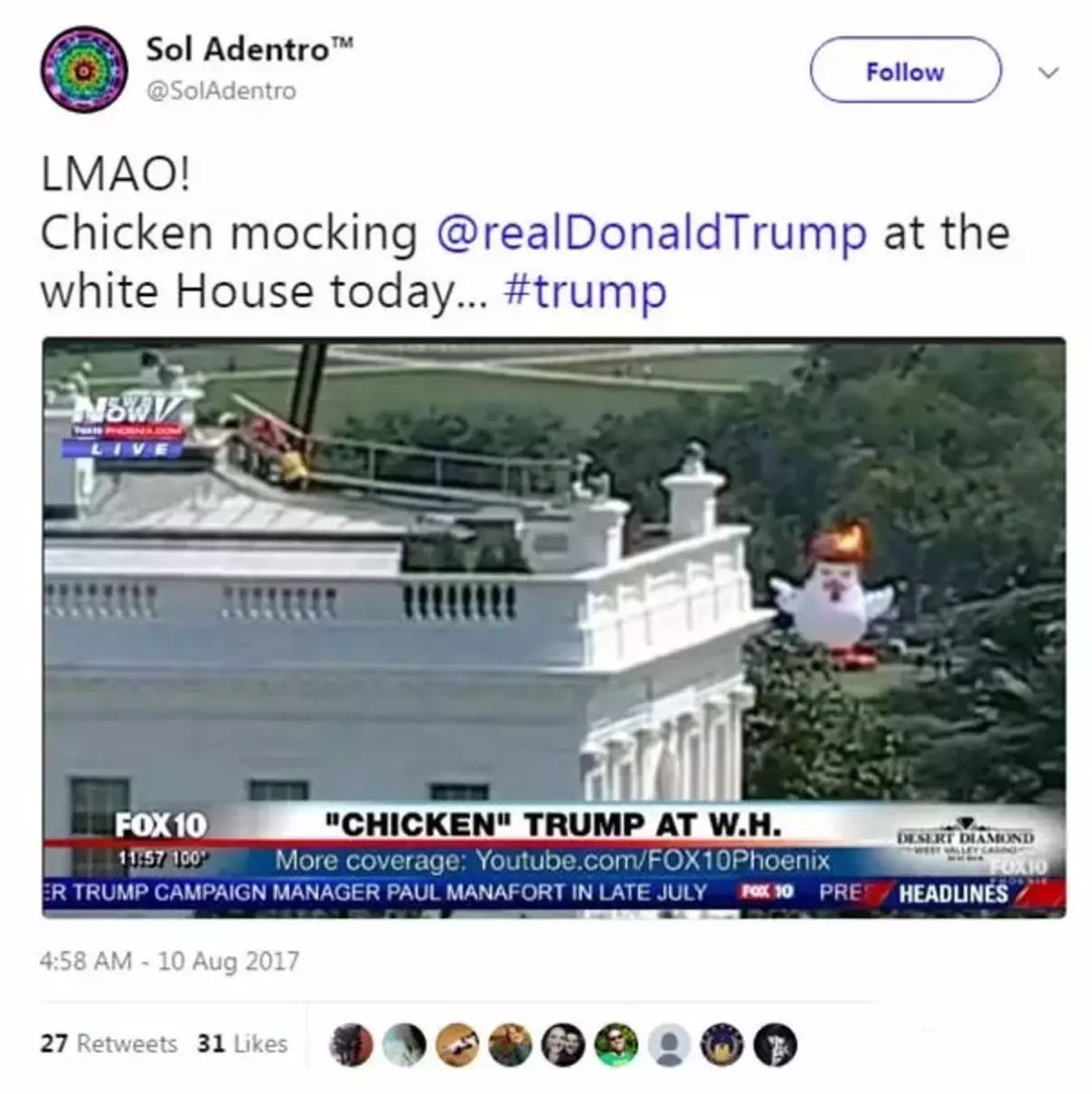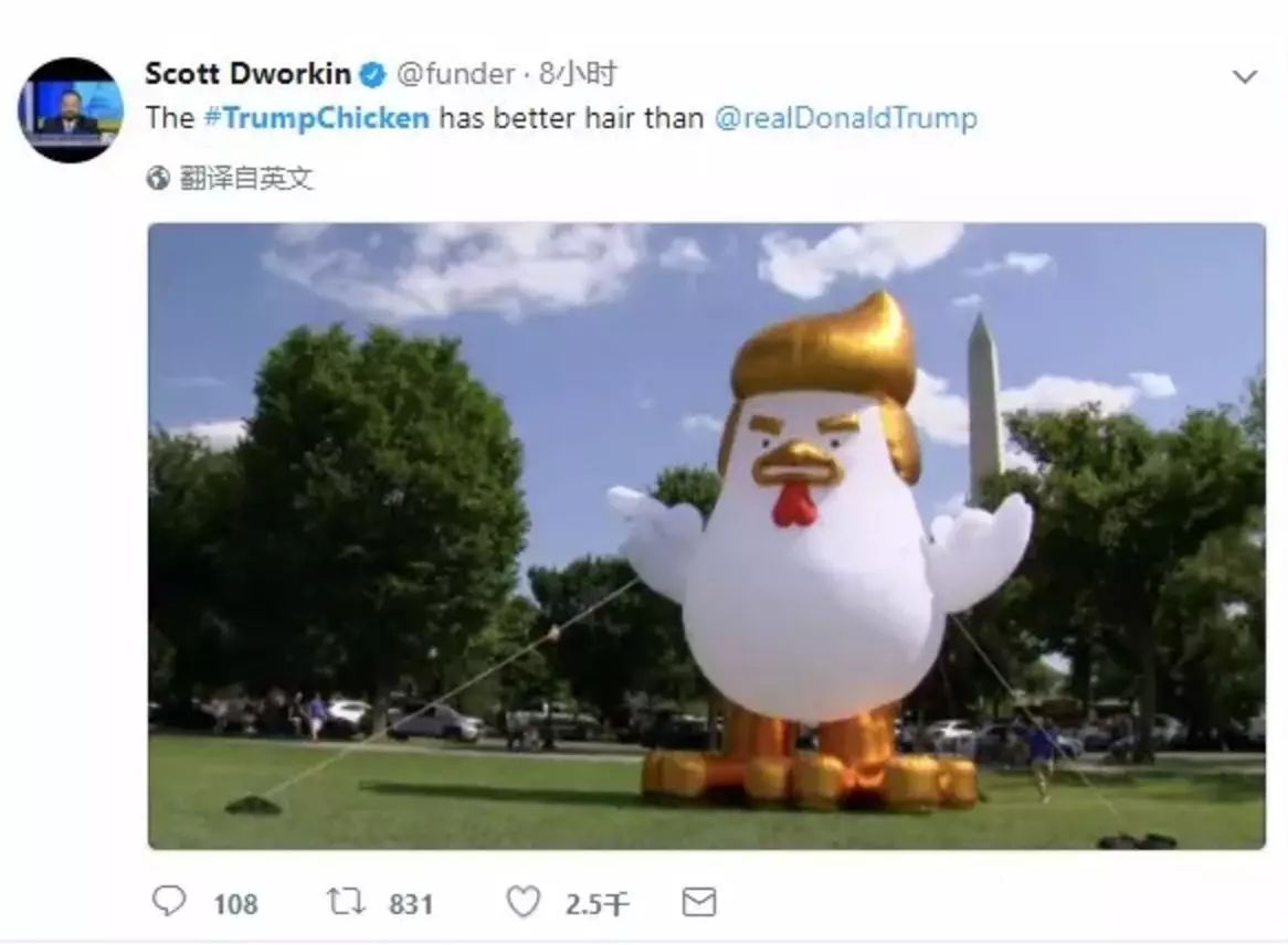 “笑死我了,今天白宫旁边出现了一只酷似川普的鸡。”