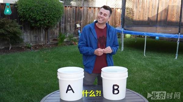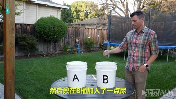 为了验证这一说法,Mark亲自测试了一心爱。他准备了两桶各约18升的纯水,然后各自加如高于标准浓度4倍的消毒用氯,接着在其中一个水桶内加入了一点尿。
