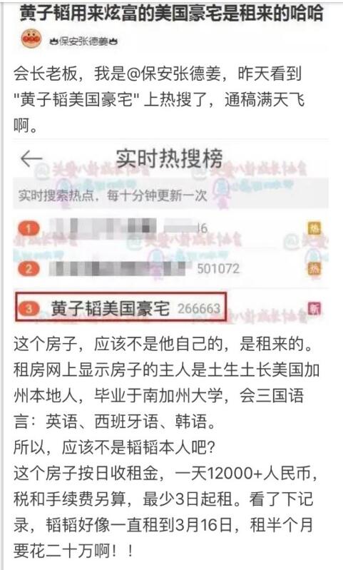 该网友还介绍称,黄子韬好像一直租到3月16日,租半个月要花20万左右。