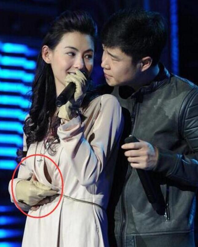 沈阳右手位置和他的小眼神,位置有点尴尬。除了手套有点难看之外,从这个角度看,张柏芝的大风衣纽扣也没有完全扣好。