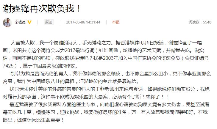 为反击谢霆锋的调侃,宋祖德日前发出最后通牒,要求谢霆锋拿出铁证,他便愿意在张柏芝生日5月24日当天直播吃屎,但却不了了之。昨谢霆锋在脸书分享自己的涂鸦作品,笑说:“其实我觉得自己画画有一点天赋,特别是在开会的时候”,而网友发现他画的正是米田共,似乎在隔空喊话,要宋祖德实现诺言。