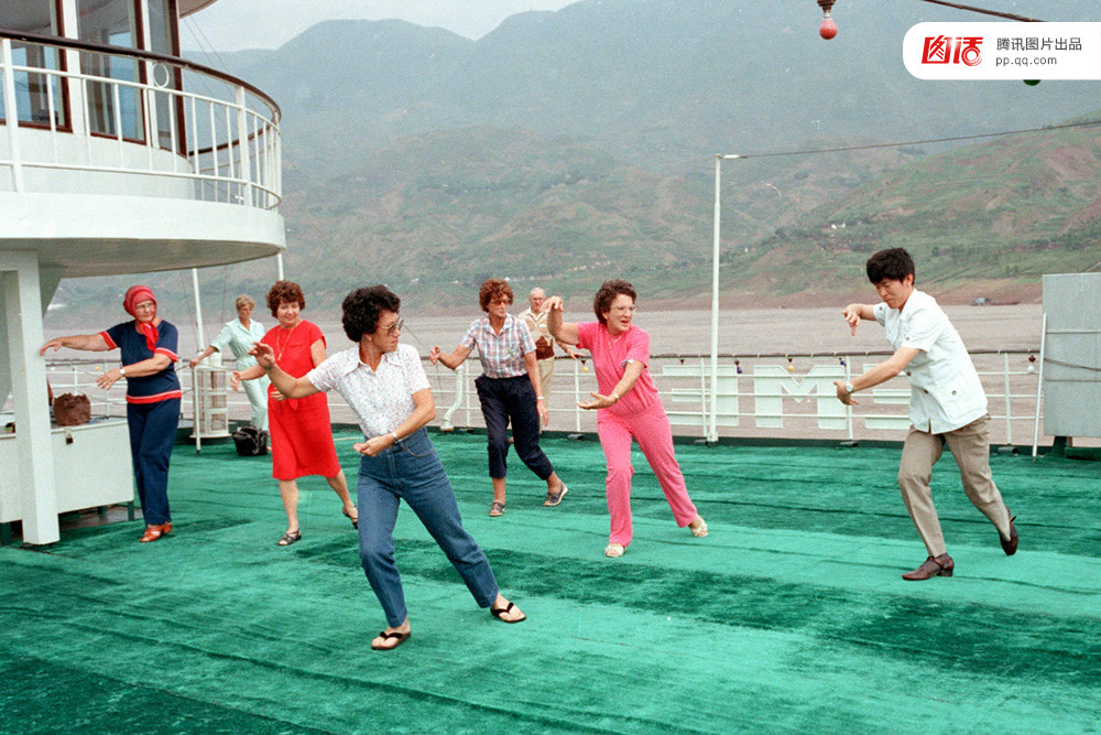 自1954年中国国际旅行社成立,之后的二三十年间,导游的身份一直是国家干部,工作性质以政治接待为主,因此进入门槛高,地位也很高,是许多在校大学生的理想职业。图为1984年,长江旅游船上,喜欢健身运动的游客向导游人员学习中国太极拳。新华社记者 于澄建 摄