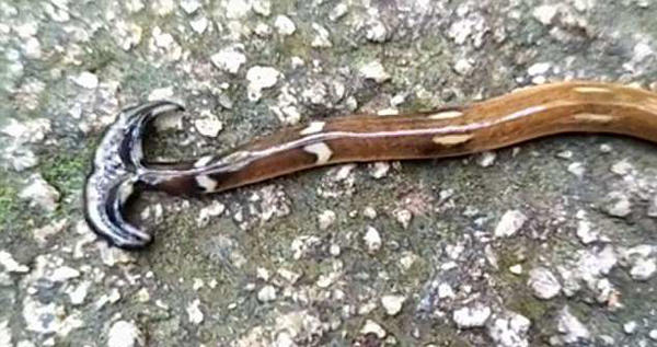 据英国《每日邮报》7月6日报道,马来西亚柔佛州首府柔佛巴鲁的男子丹尼士·霍(Danish Ho)和家人在徒步旅行途中发现了一条看似蛇的锤头状蠕虫,他们拍下视频,并上传社交平台。