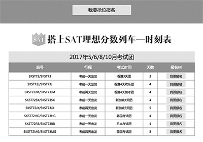 北京越来越多的公立学校开设了国际部、出国班,被称为“洋高考”的SAT、ACT考试历来是中国学生申请去美国留学前必须要参加的重要考试。北京青年报记者近日发现,由于内地没有SAT、ACT考点,考生必须要远赴境外赶考。随之而起的一种名为“SAT考团”的商业项目已经潜入了北京高中生之中。他们在旅行社推出的“SAT考团”或是学校组织的SAT考团带领下,远赴香港、澳门、台湾地区,或是日本、韩国、泰国、新加坡等周边国家的考点参加美国“洋高考”。