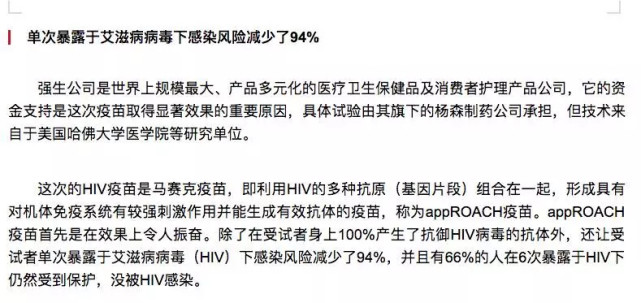 当中,还列举了一些数据,例如“100%产生了对抗HIV的抗体”和“受试者单次暴露于艾滋病病毒下感染风险减少了94%”。