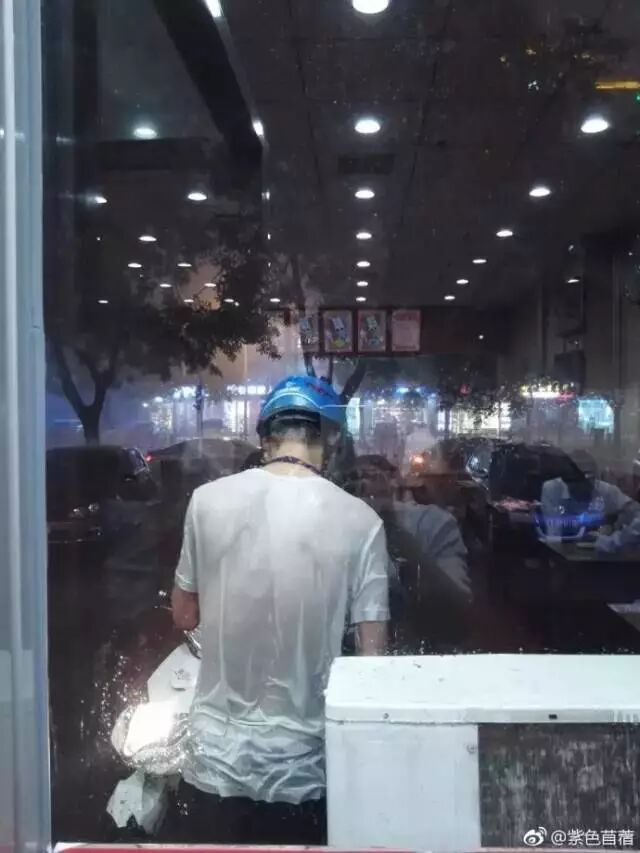 瓢泼大雨里,一位外卖小哥浑身湿透,站在屋檐下躲雨。
