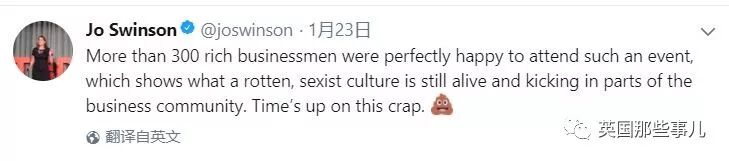 “超过300名富有的商人居然能够开心的参加这个活动,这说明腐朽的,性别歧视文化依旧在商界非常吃香。”她说,“是时候收拾这个烂摊子了。”