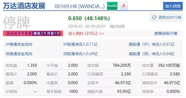 万达酒店发展今日随即复牌,股价开盘即暴涨,很快冲至2.0港元,涨幅达48.15%,市值达93亿港元,同时盘前成交785万港元。腾讯控股跌1.8%。融创中国涨2.5%。