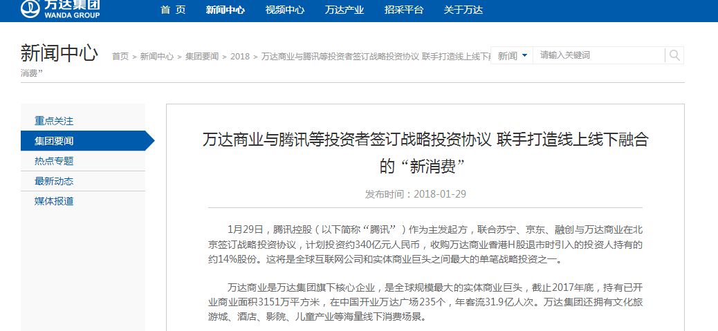 据万达官网消息,1月29日,腾讯控股作为主发起方,联合苏宁、京东、融创与万达商业在北京签订战略投资协议,计划投资约340亿元人民币,收购万达商业香港H股退市时引入的投资人持有的约14%股份。这将是全球互联网公司和实体商业巨头之间最大的单笔战略投资之一。