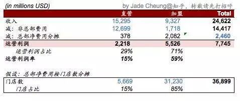 结果可以看到,直营业务虽然占收入的大头,但因为要承担餐厅运营的各项费用,最后只贡献了29%的运营利润。而加盟业务的利润率远高于直营业务,最后贡献了71%的运营利润。