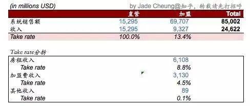 拿2016年财报的数据来算,加盟业务的佣金率(take rate)约为13.4%。其中8.8%是房租,4.5%是加盟费(还有一部分其他初始费用)。