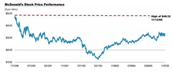 当时麦当劳刚刚走出低谷期,同店增长艰难转正,利润率慢慢回升。股价从巅峰期的48美金跌到了2005年的30美金上下。